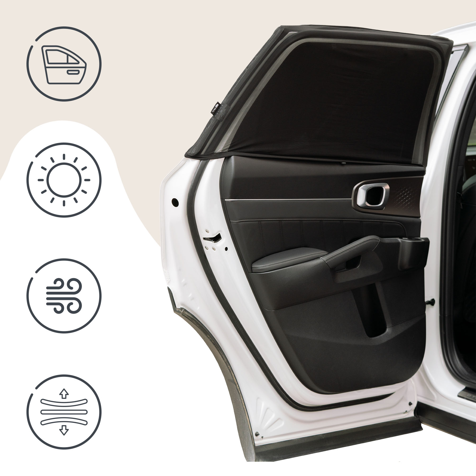 Pentru instalare, deschideti usa masinii si intindeti materialul peste marginea superioara a cadrului geamului. Apoi, trageti plasa uniform pe lateralele cadrului. Reglati tensiunea materialului pentru a se potrivi dimensiunii geamului – pot aparea pliuri mici pe geamurile mai mici, care nu afecteaza functionalitatea produsului. Pentru indepartare, deschideti usa, ridicati materialul de pe marginea superioara si pliati sau rulati pentru a evita cutele. Depozitati intr-un loc uscat, ferit de surse de caldura.