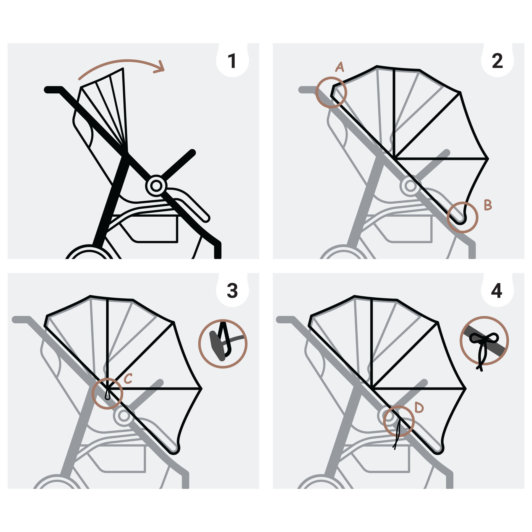 Pentru utilizare corecta, aseaza copertina uniform peste partea superioara a caruciorului. Apoi intinde partea inferioara si fixeaz-o folosind benzile de strangere si snururile de prindere cusute. In functie de pozitia soarelui, copertina poate fi montata in oricare dintre directii. Fermoarul permite deschiderea completa sau partiala, astfel incat poti verifica copilul fara a scoate intreaga plasa universala. Dupa utilizare, produsul se ruleaza si se depoziteaza in husa de transport inclusa.
