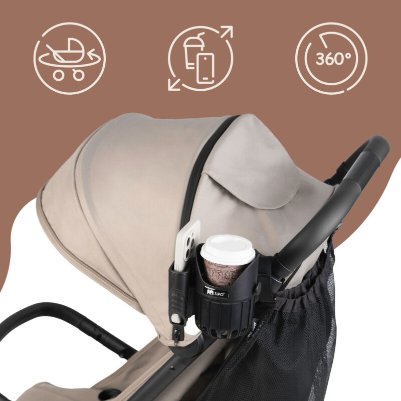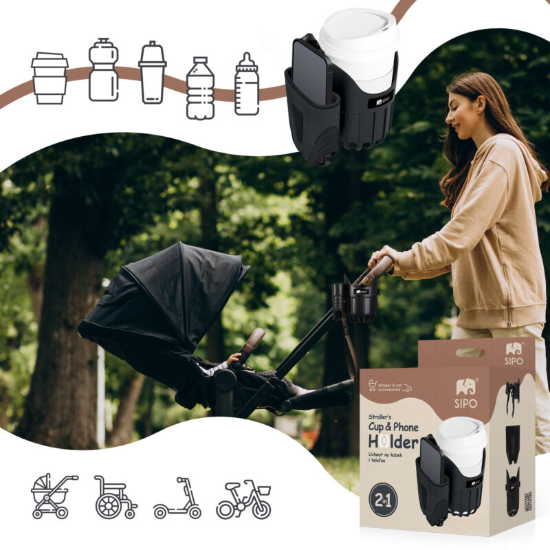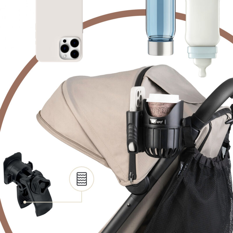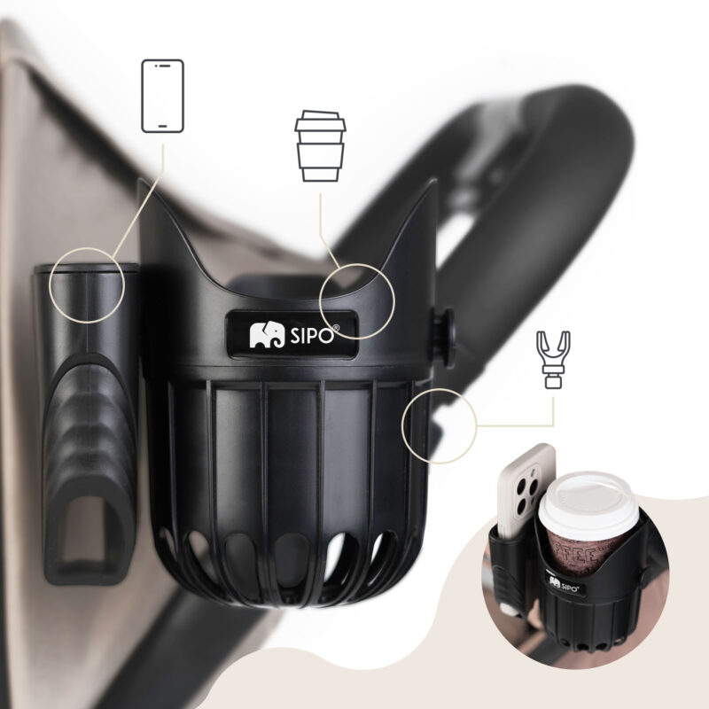 Suportul SIPO este un accesoriu inteligent 2-in-1 pentru carucior, ce imbina functionalitatea unui suport universal pentru pahar cu un suport pentru telefon. Proiectat pentru utilizare zilnica, se adreseaza parintilor care apreciaza confortul in timpul plimbarilor cu copiii.